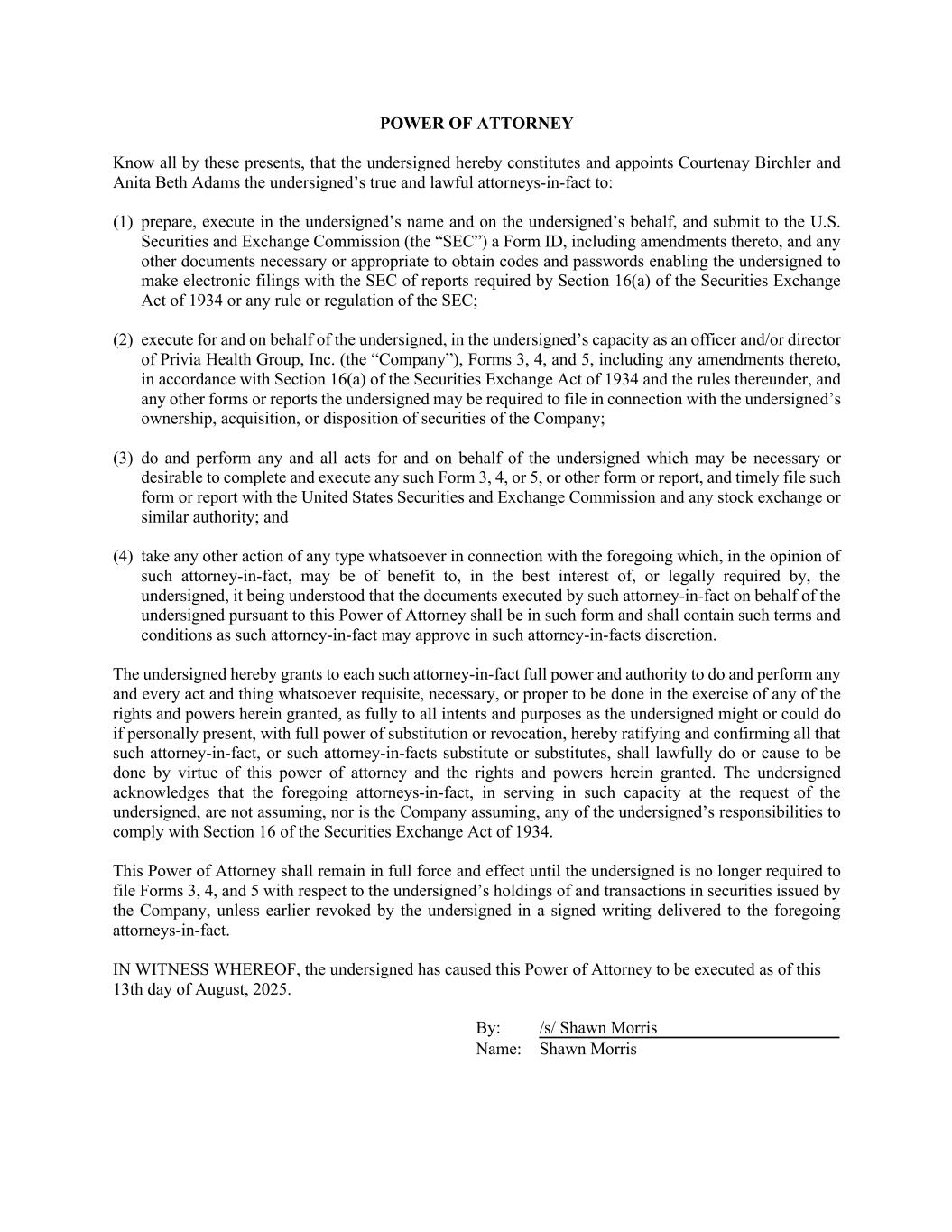 POWER OF ATTORNEY Know all by these presents, that the undersigned hereby constitutes and appoints Courtenay Birchler and Anita Beth Adams the undersigned’s true and lawful attorneys-in-fact to: (1) prepare, execute in the undersigned’s name and on the undersigned’s behalf, and submit to the U.S. Securities and Exchange Commission (the “SEC”) a Form ID, including amendments thereto, and any other documents necessary or appropriate to obtain codes and passwords enabling the undersigned to make electronic filings with the SEC of reports required by Section 16(a) of the Securities Exchange Act of 1934 or any rule or regulation of the SEC; (2) execute for and on behalf of the undersigned, in the undersigned’s capacity as an officer and/or director of Privia Health Group, Inc. (the “Company”), Forms 3, 4, and 5, including any amendments thereto, in accordance with Section 16(a) of the Securities Exchange Act of 1934 and the rules thereunder, and any other forms or reports the undersigned may be required to file in connection with the undersigned’s ownership, acquisition, or disposition of securities of the Company; (3) do and perform any and all acts for and on behalf of the undersigned which may be necessary or desirable to complete and execute any such Form 3, 4, or 5, or other form or report, and timely file such form or report with the United States Securities and Exchange Commission and any stock exchange or similar authority; and (4) take any other action of any type whatsoever in connection with the foregoing which, in the opinion of such attorney-in-fact, may be of benefit to, in the best interest of, or legally required by, the undersigned, it being understood that the documents executed by such attorney-in-fact on behalf of the undersigned pursuant to this Power of Attorney shall be in such form and shall contain such terms and conditions as such attorney-in-fact may approve in such attorney-in-facts discretion. The undersigned hereby grants to each such attorney-in-fact full power and authority to do and perform any and every act and thing whatsoever requisite, necessary, or proper to be done in the exercise of any of the rights and powers herein granted, as fully to all intents and purposes as the undersigned might or could do if personally present, with full power of substitution or revocation, hereby ratifying and confirming all that such attorney-in-fact, or such attorney-in-facts substitute or substitutes, shall lawfully do or cause to be done by virtue of this power of attorney and the rights and powers herein granted. The undersigned acknowledges that the foregoing attorneys-in-fact, in serving in such capacity at the request of the undersigned, are not assuming, nor is the Company assuming, any of the undersigned’s responsibilities to comply with Section 16 of the Securities Exchange Act of 1934. This Power of Attorney shall remain in full force and effect until the undersigned is no longer required to file Forms 3, 4, and 5 with respect to the undersigned’s holdings of and transactions in securities issued by the Company, unless earlier revoked by the undersigned in a signed writing delivered to the foregoing attorneys-in-fact. IN WITNESS WHEREOF, the undersigned has caused this Power of Attorney to be executed as of this 13th day of August, 2025. By: /s/ Shawn Morris Name: Shawn Morris